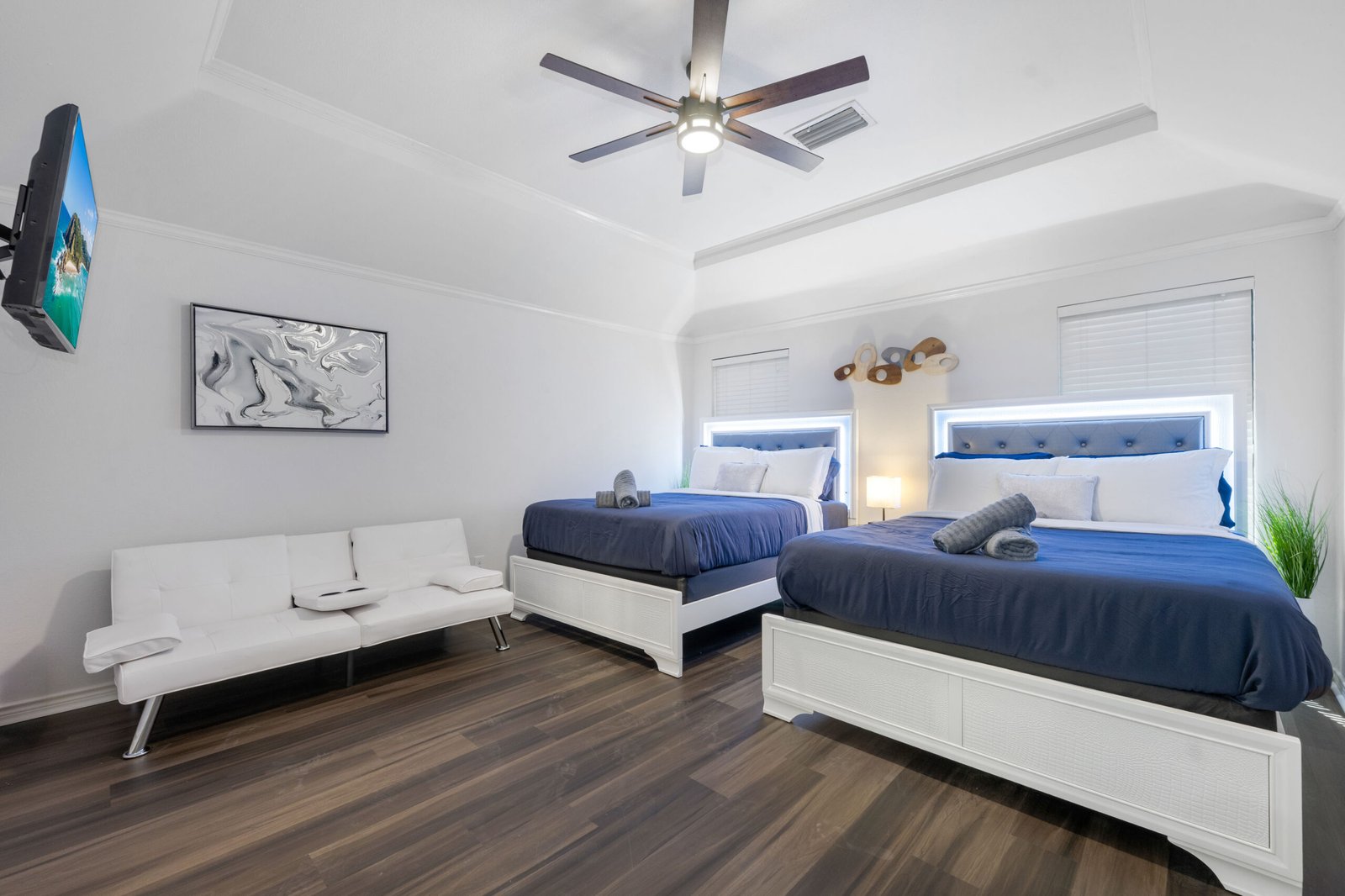 🔹Primary room: 2 queen beds, 1 futon, 2 twin mattress that can place as you choose! Attached primary full bath. (downstairs)