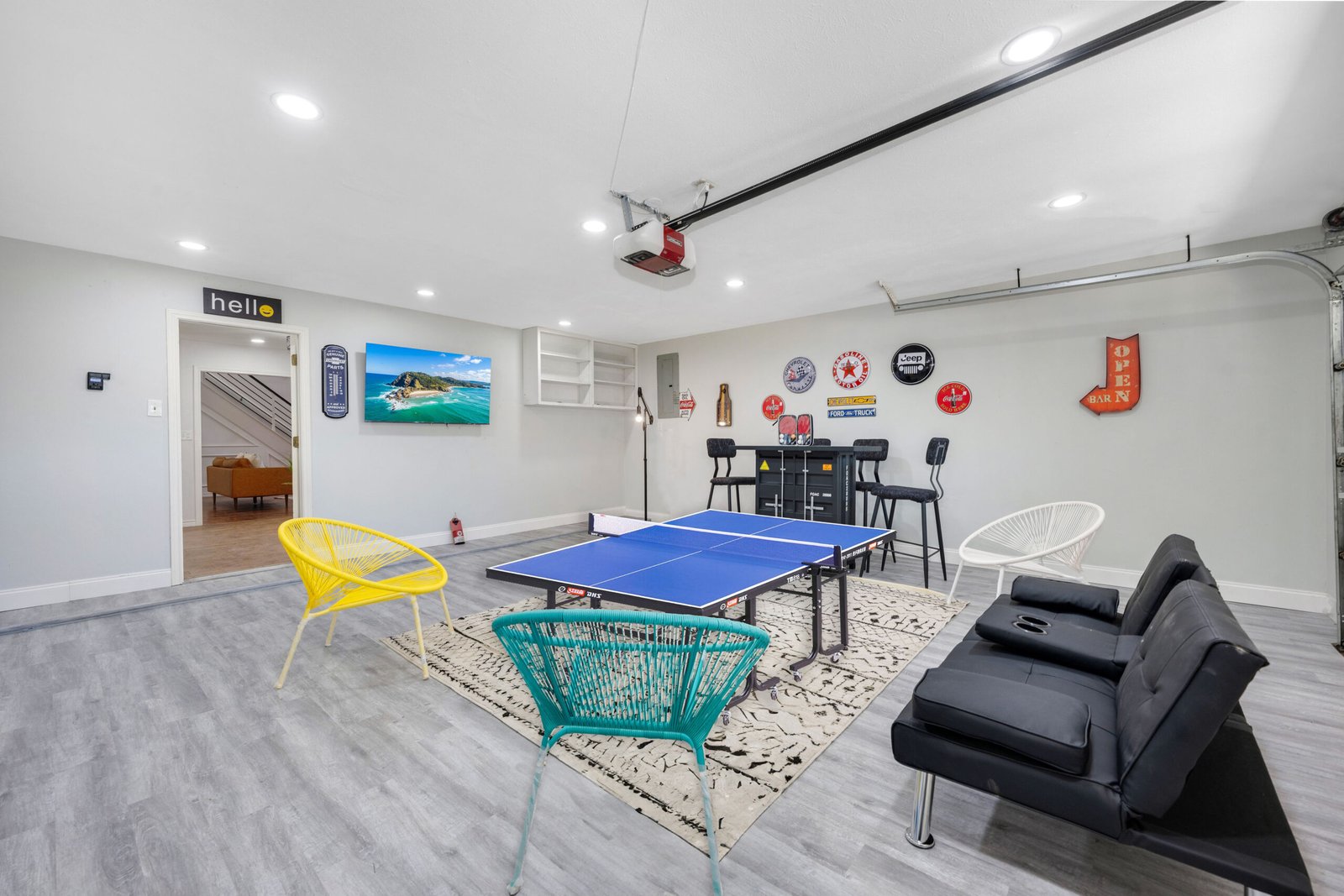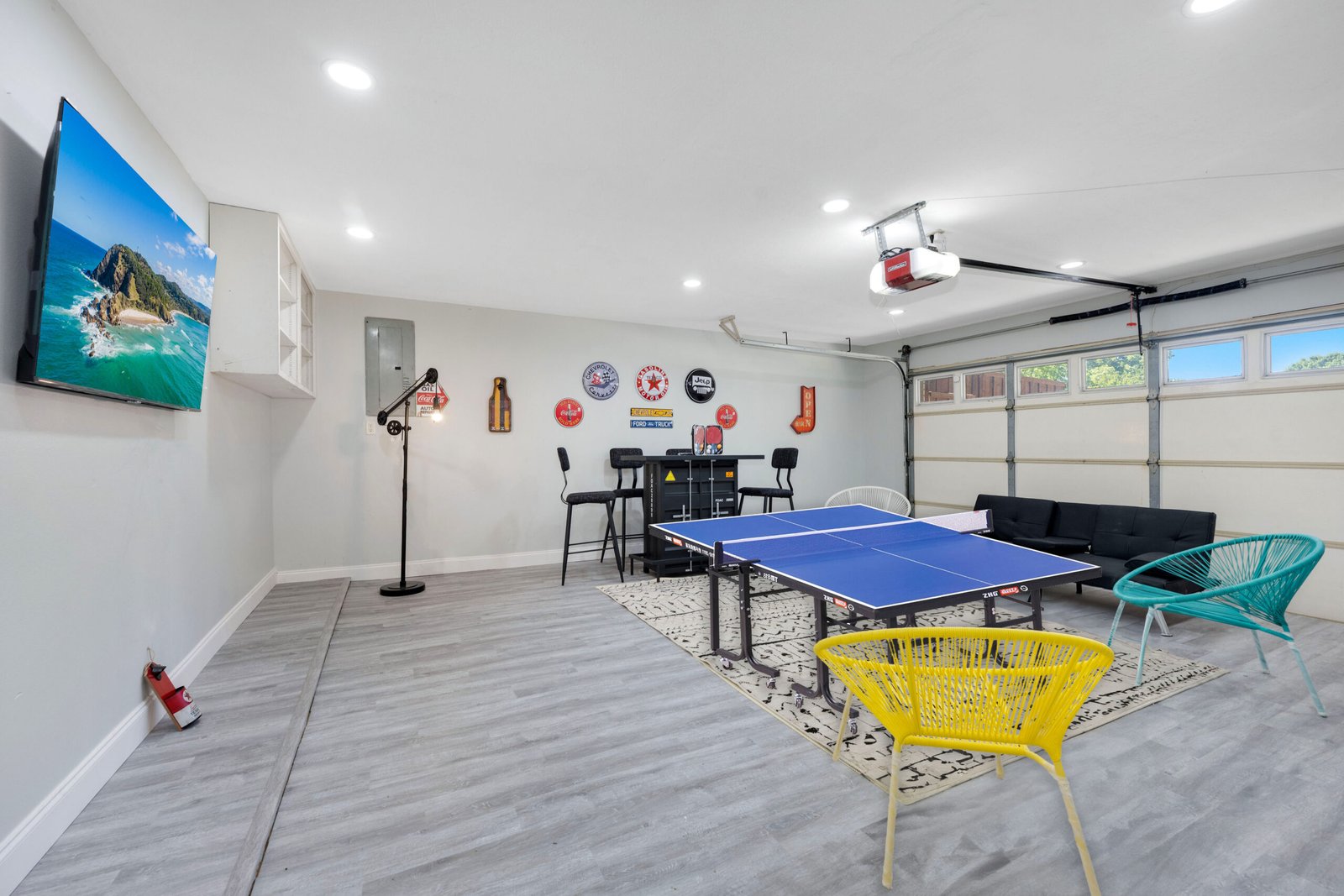 🔹Game room in garage with ping pong table and tv and another bar table and barstools along with a futon.